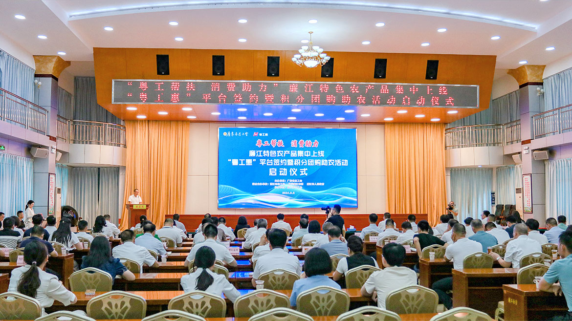 劉國(guó)斌、李更盛、陳恩才、陳慧玲、胡毅、黃培棟等領(lǐng)導(dǎo)一起按下啟動(dòng)球。劉國(guó)斌宣布“粵工幫扶 消費(fèi)助力” 積分團(tuán)購(gòu)助農(nóng)活動(dòng)正式啟動(dòng)。