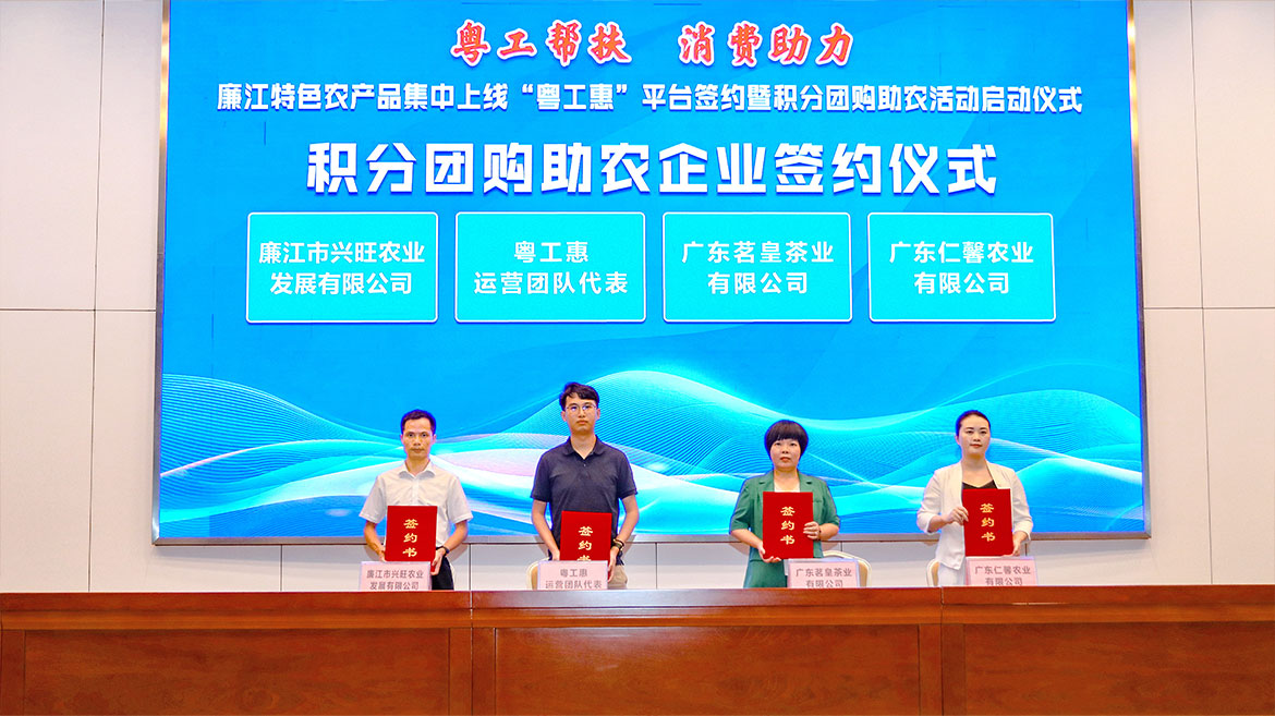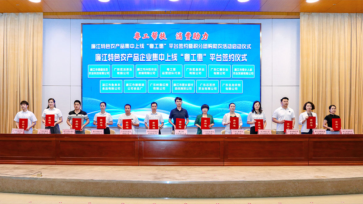 “粵工惠”運(yùn)營(yíng)團(tuán)隊(duì)負(fù)責(zé)人與參加廉江特色農(nóng)產(chǎn)品集中上線“粵工惠”平臺(tái)企業(yè)代表、參加積分團(tuán)購(gòu)助農(nóng)的企業(yè)代表簽約。